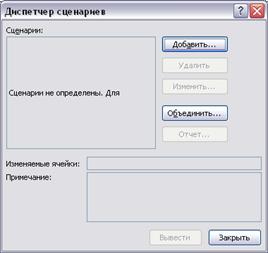 Рис. 6. 23. Диалоговое окно Диспетчер сценариев - Нажмите кнопку « Добавить… ». - Появится диалоговое окно «Добавление сценария» (рис. 6.24). Если на рабочем листе уже есть сценарий, у которого исходные ячейки совпадают с выделенными в данный момент, то появится название этого сценария. В окно «Название сценария» введите текст, однозначно характеризующий первую цену, например, «Цена = 5 руб.» (рис. 6.24). Проверьте, чтобы в поле «Изменяемые ячейки» стоял адрес В2.