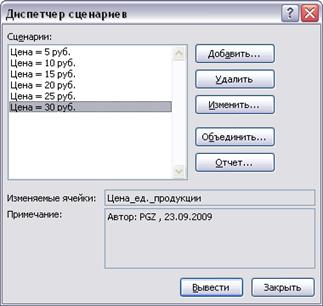 Рис. 6. 26. Диалоговое окно Диспетчер сценариев после ввода всех сценариев - Если вы нажмите кнопку « Закрыть», то в ячейке В2 установите значение цены 10 руб. и вновь продолжите расчеты. Примечание. В диалоговом окне «Диспетчер сценариев» вы также можете удалить или изменить любой сценарий, используя соответствующие кнопки. - По результатам расчетов сценариев, постройте отчет (рис. 6.26), выбрав тип отчета – структура и в качестве ячеек результата укажите адрес ячейки, содержащей значения прибыли В8 (рис. 6.27).
