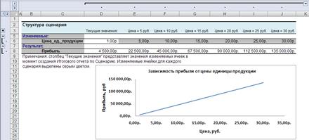 Рис. 6. 27. Задание отчета по сценарию в виде отчета В результате выполненных действий в рабочую книгу Excel будет вставлен дополнительный лист с отчетом по сценарию (рис. 6.28). - Выполните необходимое редактирование отчета (уберите столбец для текущей цены) и постройте диаграмму, иллюстрирующую изменение величины прибыли от цены единицы продукции.