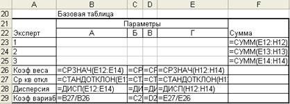 После того, как собраны мнения всех экспертов, производится обработка ее результатов. - Создается базовая таблица экспертизы (рис. 7.4). Для этого открывается имеющаяся рабочая книга Excel «Экспертный опрос». - Заносятся в таблицу ответы экспертов. - Рассчитывается средние коэффициенты веса ответов по каждому из параметров функция Excel: СРЗНАЧ() (7.2) - Рассчитывается среднеквадратическое отклонение коэффициентов веса ответов функция Excel: СТАНДОТКЛОН() (7.3) - Рассчитывается дисперсия коэффициентов веса функция Excel: ДИСП() (7.4) - Рассчитывается коэффициент вариабельности (V) ответов функция Excel: СТАНДОТКЛОН() / СРЗНАЧ() (7.5) Значение коэффициента вариабельности (V) характеризует величину разброса экспертных оценок: - При V <= 0,2 оценки экспертов можно считать согласованными. - Если V > 0,2, то целесообразно провести с экспертами содержательное обсуждение важности обсуждаемых параметров, после чего повторить экспертизу.