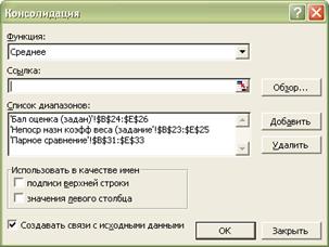 Рис. 7. 15. Параметры диалогового окна «Консолидация» - В поле « Функция » выберите функцию консолидации «Среднее». - Поместите курсор в поле « Ссылка » и укажите первый диапазон консолидации (выделите данные области $B$24:$E$26 листа «Бальная оценка». - Нажмите кнопку «Добавить». Ссылка появится в поле « Списокдиапазонов ». - Таким же образом добавьте ссылку на аналогичные данные листов «Непосредственное назначение коэффициентов веса» и «Парное сравнение». - В области « Использоватьв качестве имен » отмените флажки « подписиверхнейстроки » и « значениялевогостолбца ». В данном случае заголовки столбцов и строк не участвуют в консолидации, они уже есть в итоговой таблице. - Для автоматического обновления данных установите флажок « Создавать связи сисходнымиданными ». При этом следует учитывать, что связь можно использовать только в том случае, если исходные области и область назначения находятся на разных листах рабочей книги. - Нажмите кнопку ОК. В ячейках В7:Е15 появятся усредненные данные трех методов оценивания результатов для каждого эксперта (рис. 7.16).