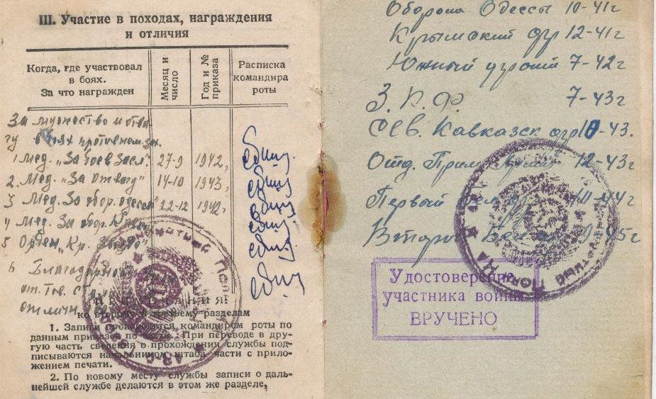 Счастливую семейную жизнь оборвала война. 9 июля Иван Петрович был мобилизован. С 11 по 17 июля был писарем в Гороховецком лагере. Потом прибыл на станцию Алабино, где обучали вождению на боевой машине «катюша» (из дневника: «шофёр 2 батареи часть 22»). 1августа 1941 год готовился к отправке на фронт, но был оставлен при артиллерийском училище «ввиду излишков шофёров». А дальше запись, сообщающая о том, что Иван Петрович «с 31 июля 1941 года служил в 8 полку 3 дивизии, седьмой батарее, шофёром Б.М. З.И.С.6». Из красноармейской книжки я узнала, что в августе 1941 года проходил службу в 48 ОГМД 1 батарея, шофёр гвардии (далее не разборчиво). Неудачи Красной Армии летом-осенью 1941 подтверждаются страницами дневника. Оборона и оставление Одессы, отступление на Керчь и эвакуация из города: таковы сведения о первых месяцах войны. «…Отходя из-под г. Изюм наши войска ведут арьергардные бои у д. Александровка; г. Старобельск. Криворожье и Каменка находились в окружении…». Наша армия отступает и оставляет противнику Литву, Латвию, Белоруссию, часть Украины, Молдавию, Эстонию. За этот период Красная Армия потеряла более 100 дивизий. Тем временем в декабре 1941 у Ивана Петровича родился ещё один сын. Жена долго не получала весточки от мужа, думала, что он погиб, и назвала сына в честь отца Иваном. Но беда подкралась с другой стороны погиб старший сын Николай в боях под Москвой. Николай Петрович был первым председателем Воздвиженского колхоза им. Ворошилова. Коммунист. Ушел добровольцем на фронт, хотя имел бронь. Погиб под Москвой в ноябре 1941 года. А Иван Петрович был жив, просто не удавалось долго послать весточку. Его боевой путь связан с дорогой т.к. был шофёром боевой машины «катюша». В дневнике в основном записаны названия городов, других населённых пунктов, где проходили военные операции (либо просто место прибытия на пути к необходимому месту назначения). На первом месте в строчке указана дата прибытия, а завершается строчка цифрой, означающей показатель спидометра. Из дневника я узнала о том, что, будучи на фронте Иван Петрович вступил в партию, стал коммунистом. Младший брат, Василий Петрович получил профессию агронома. Перед самой войной был направлен на работу в Белоруссию, город Боровичи на МТС. Война его там и застала. Партизанил. В мае 1942 года партизанский отряд присоединился к частям Красной Армии. После окончания курсов командиров был отправлен на Ленинградский фронт, где пропал безвести. Особое внимание стоит уделить боевой технике – нашим катюшам. Катю́ша — появившееся во время Великой Отечественной войны 1941—1945 неофициальное название бесствольных систем полевой реактивной артиллерии (БМ-8, БМ-13, БМ-31 и других). Такие установки активно использовались Вооружёнными Силами СССР во время второй мировой войны. В ходе Смоленского сражения под Оршей советские войска впервые применили реактивную артиллерию, легендарные «катюши». Несмотря на столь нежное название, они наводили страх и панику на врага. Ими очень дорожили и как рассказывала мне бабушка (она, конечно, узнала это от отца) после обстрела «катюши» сразу же немедленно покидали поле боя, а в ситуации, когда технику мог захватить неприятель, (например, если попадали в окружение) их уничтожали. Для этого в машинах находилась взрывчатка. В 1942 продолжались тяжёлые бои: «в туапсинском районе поездки самые т