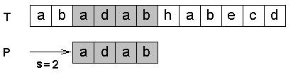 при несовпадении на i-ой позиции образец можно подвинуть по тексту на: 0: 0 - (-1) = 1 1: 1 – (-1) = 2 2: 2 – (-1) = 3 3: 3 – 0 = 3 4: 4 – 1 = 3 5: 5 – 2 = 3 /////////////////////////////////////////////////// int FindKMP (char* text, char* pat) { int i, j, lenT, lenP, d[100]; lenT = strlen(text); lenP = strlen(pat); CompF(pat, d); i=0; j=-1; for (i=0; i < lenT; i++) { while (j>=0 && text[i]!=pat[j+1]) j = d[j]; if (text[i] == pat[j+1]) j++; if (j+1==lenP) return 1; } Date: 2015-07-27; view: 356; Нарушение авторских прав |