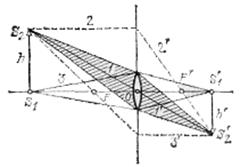 Отметим, что при всех построениях лучей, проходящих через тонкую линзу, мы можем не рассматривать ход их внутри самой линзы. Важно лишь знать расположение оптического центра и главных фокусов. Таким образом, тонкая линза может быть изображена плоскостью, проходящей через оптический центр перпендикулярно к главной оптической оси, на которой должны быть отмечены положения главных фокусов. Эта плоскость называется главной плоскостью. Очевидно, что луч, входящий в линзу и выходящий из нее, проходит через одну и ту же точку главной плоскости. Если мы сохраняем на рисунках очертания линзы, то только для