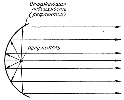 В радиолокационных антеннах первоначальным излучателем энергии чаще всего служит обычный полуволновый вибратор. Различные сочетания этих вибраторов или комбинация одного вибратора с «пассивными», ни к чему не подсоединенными проводниками позволяют направить излучаемую энергию в заданном направлении. К числу таких антенн относится так называемая «директорная» (направляющая) антенна. Активным излучателем энергии в ней служит обычный полуволновый вибратор. К нему подсоединяется приходящая от передатчика двухпроводная линия. На расстоянии порядка четверти длины волны на общей рее укреплен металлический стержень длиной около половины волны. Он называется рефлектором (отражателем). Волны, излученные активным вибратором, и отраженные волны рефлектора интерферируют между собой так, что ослабляют излучение в сторону рефлектора и усиливают в сторону, противоположную ему. Такая приемная антенна часто используется и для телевизора, особенно на большом расстоянии от телевизионного центра, когда сила поля невелика и приходится повышать чувствительность. Для того чтобы образовать узкий луч, необходимо всю энергию направить лишь в одну сторону. В упомянутой директорной антенне {33} для этой цели применяется ряд стержней, несколько меньших по длине, чем активный вибратор. Все они укреплены на общей рее и находятся перед вибратором. Расстояния между ними подобраны таким образом, что их собственные поля, складываясь с полями активного вибратора и рефлектора, еще более усиливают излучение в нужную сторону. Такие стержни называются директорами (направителями), откуда и получила свое название антенна. Для формирования радиолуча используются многие свойства электромагнитных волн. Естественно, что общность природы световых и радиоволн позволяет перенести в радиолокацию и методы формирования светового луча.