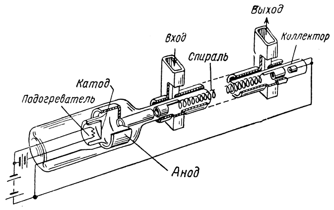 Еще один замечательный прибор современной радиотехники — лампа с бегущей волной. Между ней и клистроном есть много общего. Так же как и там, группирующийся в пучки электронный луч взаимодействует с электромагнитным полем, отдает ему свою энергию. Но только теперь это поле уже не сосредоточено в каком-то определенном месте, оно «бежит» вместе с электронным лучом, окружая его. Устройство, создающее электронный луч,— такое же, как и в клистроне. Правда, для того чтобы луч не расходился, используют специальную фокусирующую катушку, создающую продольное