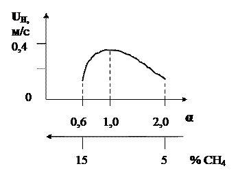Величина нормальной скорости распространения пламени зависит от природы горючего газа и состава ГВС, т.е. от коэффициента α. На рис. 3 показана зависимость нормальной скорости от коэффициента α для метановоздушной смеси.