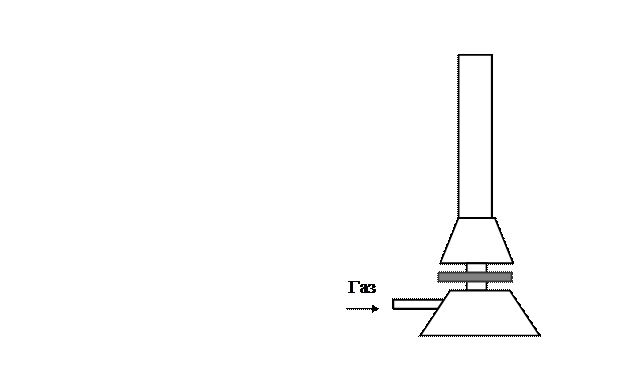 Горелка Бунзена – изобретение Роберта Бунзена (1855). Горелка имеет круглое основание – 1, смеситель (инжектор) – 3 в виде металлической трубки, в нижней части которой имеются отверстия для поступления воздуха и регулятор расхода воздуха – 2. Газ подводится с боку из газопровода. При работе горелки газ в виде струи с большой скоростью выходит из сопла, создавая разрежение в смесителе. Благодаря этому разрежению, окружающий воздух засасывается (инжектируется) в смеситель и при движении вверх смешивается с газом, образуя горючую смесь, которая поджигается на выходе из устья горелки. Горелка Тэклю – изобретение Николая Тэклю (1890) – имеет аналогичное устройство с горелкой Бунзена. Только у горелки Тэклю нижняя часть смесителя расширена. Воздух поступает в щель между расширенной частью смесителя и диском – 2, вращением которого изменяют ширину щели, уменьшая или увеличивая приток воздуха. Пламя лабораторной горелки имеет два фронта горения. Во внутреннем фронте горение происходит за счет первичного воздуха (α < 1). Во внешнем фронте происходит догорание за счет кислорода окружающего воздуха. Внутренний фронт ярко очерчен и имеет зеленовато-голубоватую окраску. Внешний фронт имеет размытые контуры и фиолетовую окраску. На рис. 10.5 показано устье горелки и структура пламени.