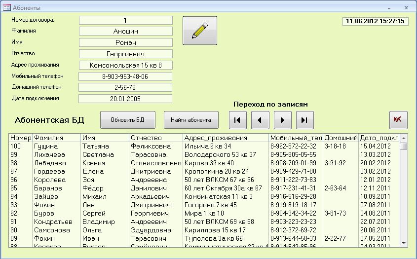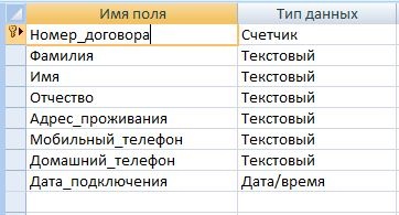 Рисунок 3.5 – Таблица «Абонентская_БД» Б) Таблица «Заявки» связана отношением многие к одному с таблицами «Сотрудники» и «Абонентская_БД», отношением один ко многим с таблицей «Список_работ». Структура таблицы «Заявки» представлена на рисунке 3.6.