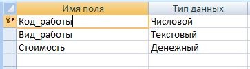 Рисунок 3.7 – Таблица «Список_работ» Д) Таблица «Прайс_лист» связана отношением один ко многим с таблицей «Список_работ». Структура таблицы «Прайс-лист» представлена на рисунке 3.8.