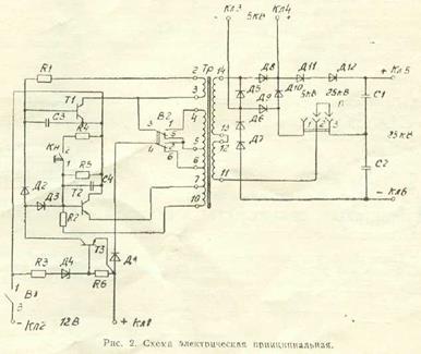 4.1. На лицевой поверхности преобразователя расположены: клавишный переключатель включения и отключения напряжения питания, дисковый и клавишный переключатели пределов 5 кВ, 25 кВ. В клеммы выхода 25 кВ вставляются съемные борны. Один из борнов, имеющий горизонтальную ось, подвижный. При помощи ручки можно изменять расстояния между шарами борнов до момента появления разряда. Шары борнов съемные. При снятии шаров поверхность стекания разряда становится конусной, что позволяет получить разрядный промежуток в два, три раза больше по сравнению с шаровыми поверхностями. Для установки требуемого выходного напряжения необходимо клавишный и дисковый переключатели установить в соответствии с используемым выходом. С этой целью дисковый переключатель необходимо вынуть из гнезда и установить так, чтобы стрелка диска совпадала с маркировкой. На боковых поверхностях расположены клеммы для подключения питания и выход 5 кВ. 4.2. Напряжение источника питания подается на генератор, состоящий из мульти вибратора с индуктивной обратной связью, собранного на транзисторах T1, T2, включенных по схеме с общим коллектором, и трансформатора. Для обеспечения надежно го самовозбуждения создана ассиметрия схемы путем включения в цепь базы Т2 резистора R5 (см. рис. 2). Вследствие искусственной ассиметрии транзистор Т2 открывается быстрее. Напряжение питания через открытый транзистор Т2 прикладывается к половине эмиттерной обмотки. В базовых обмотках наводится ЭДС, прикладываясь отрицательным потенциалом к базе транзистора Т2 и положительным потенциалом к базе Т1. Транзистор Т2 открывается благодаря нарастанию отрицательного потенциала на базе. Одно временно транзистор Т1 вследствие нарастания на базе положительного потенциала полностыо закрывается. В течение времени, когда транзистор Т2 открыт, сердечник трансформатора находится в режиме насыщения. При достижении насыщения индуктируемые в обмотках напряжения падают. Ток в обмотках также уменьшается, что ведет к уменьшению магнитного потока. Это изменение потока приводит к индуктированию в обмотках ЭДС противоположной полярности. Вследствие этоготранзистор Т1 открывается, а транзистор Т2 закрывается. Аналогично происходят дальнейшие автоколебательные процессы в генераторе. В выходной обмотке трансформатора наводится повышенное напряжение, определяемое величиной коэффициента трансформации. Переменное напряжение с выходной обмотки трансформатора преобразуется в постоянное для выхода 25 кВ с помощью схемы удвоения на селеновых выпрямителях Д5... Д8, Д11, Д12, конденсаторах C1, С2, а для выхода 5 кВ с помощью однофазной мостиковой схемы на селеновых выпрямителях Д5, Д8...Д10. Преобразователь имеет электронную защиту от перегрузок. Схема защиты состоит из транзистора ТЗ, диодов Д1...Д4 и резистора R3. В рабочем состоянии транзистор ТЗ и диоды Д2...Д4 закрыты. При увеличении напряжения более 12 В диод Д4 и транзистор Т3 открываются. При этом с баз транзисторов Т1 и Т2 снимаются отрицательные импульсы индуктируемого напряжения, генерация прекращается и высокое напряжение па выходе снижается до нуля. Кнопка КН и резистор R4 служат для принудительного запуска преобразователя в случае отсутствия самовозбуждения.