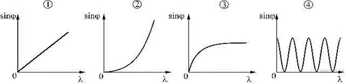 63. На дифракционную решетку нормально падает плоская монохроматическая световая волна. На экране за решеткой третий дифракционный максимум наблюдается под углом к направлению падения волны. На каком из приведенных графиков правильно показана зависимость от длины волны падающего света?