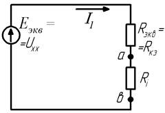 где Uxx – напряжение холостого хода, В; Rкз – внутреннее сопротивление цепи при отключенной нагрузке и закороченных источниках ЭДС, Ом; Ri – сопротивление резистора, где определяется ток, Ом.