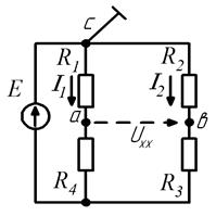 Uxx – I2R2 + I1R1 = 0; Uxx = I2R2 – I1R1. Токи в ветвях (см. рисунок 7, б):