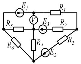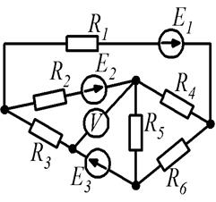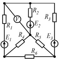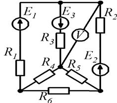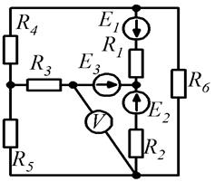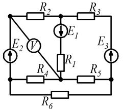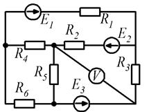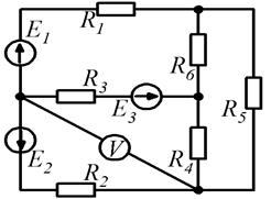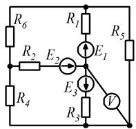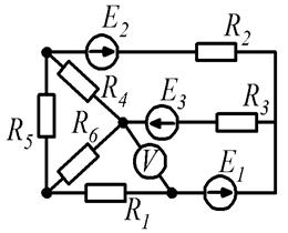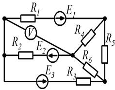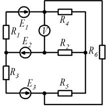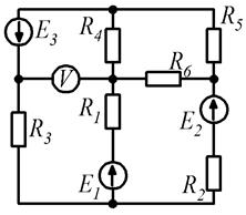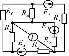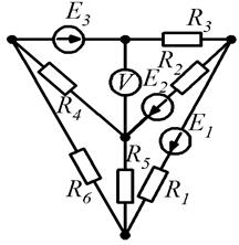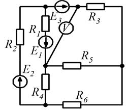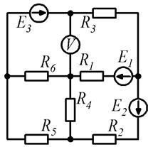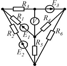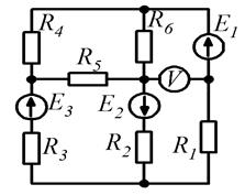 Для электрических схем, соответствующих номеру варианта и изображенных на рисунках 8 – 57 (номер рисунка указан в таблице 1), выполнить следующее: – составить систему уравнений, необходимых для определения токов в ветвях по первому и второму законам Кирхгофа, не решая ее; – найти все токи в ветвях, пользуясь методом контурных токов; – составить баланс мощностей для заданной схемы; – проверить правильность решения, применив метод двух узлов, предварительно упростив схему, заменив треугольник сопротивлений R4, R5, R6 эквивалентной звездой. Начертить расчетную схему с эквивалентной звездой и показать на ней токи; – определить ток в резисторе R6 методом эквивалентного генератора напряжения; – определить показание вольтметра; – построить потенциальную диаграмму для внешнего контура.