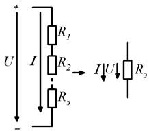 а) замена нескольких, последовательно или параллельно соединенных, резисторов одним (рисунок 1); б) преобразование треугольника резисторов в эквивалентную звезду и наоборот (рисунок 2).