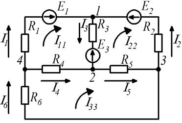 Е1 - Е3 = I1R1 + I3R3 - I4R4 – контур 1,2,4,1; Е3 - Е2 = - I2R2 - I5R5 - I3R3 – контур 1,3,2,1; 0 = I5R5 + I6R6 + I4R4 – контур 2,3,4,2;