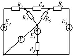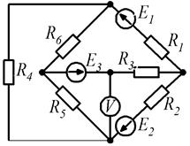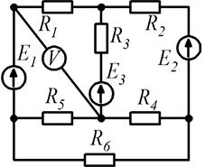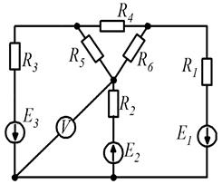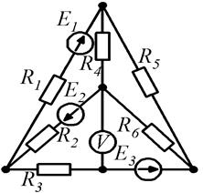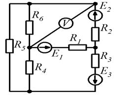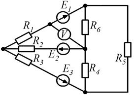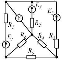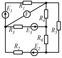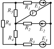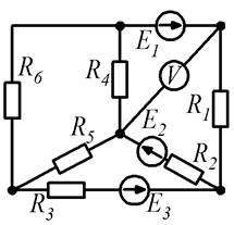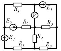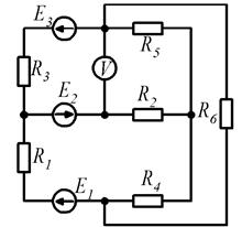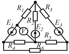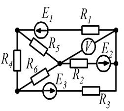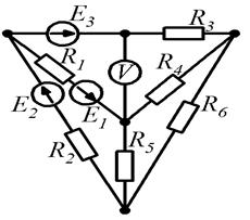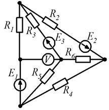 Для электрических схем, соответствующих номеру варианта и изображенных на рисунках 8 – 57 (номер рисунка указан в таблице 1), выполнить следующее: – составить систему уравнений, необходимых для определения токов в ветвях по первому и второму законам Кирхгофа, не решая ее; – найти все токи в ветвях, пользуясь методом контурных токов; – составить баланс мощностей для заданной схемы; – проверить правильность решения, применив метод двух узлов, предварительно упростив схему, заменив треугольник сопротивлений R4, R5, R6 эквивалентной звездой. Начертить расчетную схему с эквивалентной звездой и показать на ней токи; – определить ток в резисторе R6 методом эквивалентного генератора напряжения; – определить показание вольтметра; – построить потенциальную диаграмму для внешнего контура.