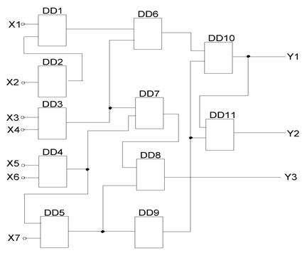ñõåìå, ïðèâåäåííîé íà ðèñ.3, îïðåäåëèòü ëîãè÷åñêèå âåëè÷èíû íà âûõîäàõ Y1, Y2,Y3. Çíà÷åíèÿ âõîäíûõ âåëè÷èí äàíû â òàáëèöå 1, à ëîãè÷åñêèå ýëåìåíòû â òàáëèöå 2 (DD2 è DD9 äëÿ âñåõ âàðèàíòîâ ëîãè÷åñêèé ýëåìåíò ÍÅ).