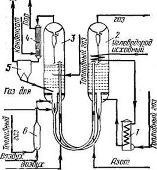 Рисунок 2.6. Узел дегидрирования бутана в н-бутилены в кипящем слое пылевидного катализатора: 1 — печь для перегрева углеводородов; 2 — реактор для дегидрирования; 3 — регенератор; 4 — котел-утилизатор; 5 — электрофильтр; 6 —топка.
