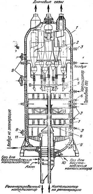 Рис. 2.8. Регенератор для восстановления активности катализатора: 1 — корпус; 2 — циклоны; 3 — штуцеры для термопар; 4 — тражатель потока катализатора; 5 — клапаны для ссыпания катализатора; 6 — штуцер для дифманометра; 7 - секционирующие решетки; 8 — транспортная линия катализатора; 9 — люки; 10 — штуцер для опорожнения; 11 — газораспределительная решетка.