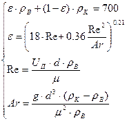 где ε – порозность кипящего слоя; ρв – плотность бутана при условиях в реакторе, 1,179 кг/м3; ρк – кажущаяся плотность катализатора; Uп – скорость псевдоожижения, 0,05м/с; d – диаметр частиц катализатора, 0,05мм; μ – динамическая вязкость бутана при условиях в реакторе,0,000373 пз. Первое уравнение описывает плотность кипящего слоя, второе используется для нахождения порозности кипящего слоя, третье и четвертое для нахождения значения критериев описывающих гидродинамику потока. Решаем систему уравнений: