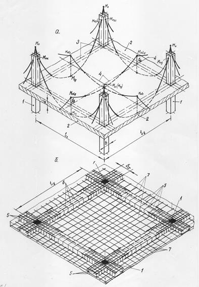 Рис.1. Принципиальная схема объемного армирования плиты плоского перекрытия монолитного железобетонного каркаса многоэтажного здания. а – общий вид ячейки фрагмента каркаса и распределение изгибающих моментов в сечениях плиты перекрытия, б – схема объемного армирования плиты; 1- колонны, 2 – плита перекрытия, 3 – створ колонн, 4 –сечение в середине пролета ячейки перекрытия, 5 – объемные арматурные каркасы «условных» ригелей в створах колонн, 6 – поперечная арматура (хомуты) объемных арматурных каркасов, 7 – нижние плоские арматурные сетки ячеек перекрытия. вдоль колонн 1 располагают объемные арматурные каркасы 5 с продольной нижней и верхней рабочей арматурой, количество которой определяют по расчету в соответствии с величиной и знаком изгибающего момента, действующего в створах 3 колонн 1. Поперечную арматуру этих арматурных каркасов 5 выполняют в виде полнозамкнутых хомутов 6. Хомуты 6 предназначены воспринимать возможные крутящие моменты относительно продольной оси каркаса5 (створа 3 колонн). В приопорных зонах у колонн 1 эти хомуты 6 их вертикальными ветвями должны в сочетании с бетоном плиты 2 обеспечить восприятие поперечного усилия (усилия продавливания плиты 2 колонной 1). В пролете между колоннами 1 хомуты 6 горизонтальными участками воспринимают изгибающий момент, действующий в плите 2 поперек створа 3 колонн (см. рис. 1а). Таким образом, в плите 2 в створах колонн 1 после укладки монолитного бетона образуется система перекрестных скрытых в пределах толщины плиты 2 железобетонных ригелей. Каждую ячейку плиты 2, огражденную указанными скрытыми ригелями, армируют понизу арматурными сетками 7, концы рабочей арматуры которых заведены за рабочую арматуру объемных каркасов, образующих указанные условные скрытые ригели. Тем самым, обеспечена анкеровка рабочей арматуры сеток 7 в этих условных ригелях. Таким образом, в плоскости плиты 2 образована опорная система скрытых условных несущих ригелей с объемными арматурными каркасами 5 и плиты ячеек перекрытия, защемленные по четырем створкам в этих скрытых ригелях. Чтобы обеспечить примерно одинаковые условия работы под нагрузкой всех ячеек плиты перекрытия, на наружном контуре плиты в створах наружного ряда колонн выполняют бортовую балку 3 (рис. 2) с высотой сечения, превышающей толщину плиты. В тех пролетах, где плита выполнена с консолью за наружный ряд колонн 1, устройство бортовой балки 3 необязательно. В крайних ячейках (пролетах) каркаса армирование условных скрытых ригелей объемными каркасами осуществляют аналогично (см. рис.2б), как и в рассмотренном выше случае (см. рис. 1б). Необходимо отметить, что в обоих рассмотренных случаях, если площади сечения верхних ветвей хомутов недостаточно для восприятия отрицательного момента М ol, действующего в пролете поперек створа колонн, сверху над объемным каркасом в каждом пролете между колоннами может быть размещена верхняя плоская арматурная сетка (см. рис.2в) с дополнительной поперечной рабочей арматурой 9. Бортовые балки 3 также содержат объемные арматурные каркасы.