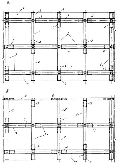 Рис.3. Варианты размещения объемных арматурных каркасов по плите перекрытия. а – при консолях плиты, б – при устройстве бортовой балки. 1 – сквозные объемные каркасы условных ригелей на два пролета, 2 – объемные каркасы условных ригелей с выпуском консоли плиты, 3 – арматура надопорных участков условных ригелей, объединяемая по месту над колонными, 4 – арматурный каркас консолей плиты, 5 – сквозные объемные каркасы бортовой балки, 6 – надопорная арматура каркасов 5, 7 – консоли плиты перекрытия. 5. Арматуру нижних сеток плиты перекрытия в каждой ячейке (рис 4) выполняют с размещением их концов за крайний ряд нижней рабочей арматуры объемных каркасов на величину lan = 200±10мм. Причем, из условий производства работ в каждой ячейке размещают, как правило по 2…3 сварные сетки с перехлестом laх их рабочей арматуры в середине ячейки, определенном по величине lan согласно указаний п. 5.38, формулы 186 и табл. 37 СНиП 2.03.01-84*.