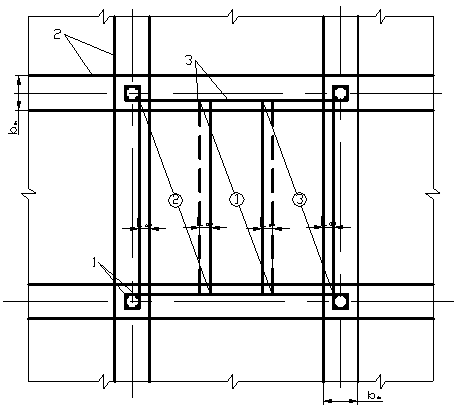Рис.4. Пример размещения сеток нижней арматуры в ячейке каркаса, вид в плане. 1 – рабочая арматура колонн, 2 – объемные арматурные каркасы условных ригелей, 3 – кромки арматурных сеток. Цифрами в кружках обозначена последовательность установки арматурных сеток ячейки. 6. Арматуру верхних сеток устанавливают непосредственно на объемные каркасы условных ригелей. 7. Сквозные проемы в плитах перекрытий для пропуска вертикальных коммуникаций между объемными арматурными каркасами можно устраивать любых размеров в пределах ячеек без пересечения арматуры объемных арматурных каркасов. В пределах плана объемных арматурных каркасов можно устраивать одиночные сквозные отверстия с наибольшим размером в плане в пределах 10-15 см и при расстоянии между ними не менее 50см. 8. При размещении арматуры в элементах каркаса должны быть полностью соблюдены требования СНиП.2.03.01-84* по конструированию и назначению вида и количества строительной арматурной стали. При этом в качестве продольной рабочей арматуры объемных каркасов условных скрытых ригелей, рабочей арматуры нижних и верхних сеток следует назначать преимущественно сталь класса А-500с, в качестве поперечной арматуры условных ригелей диаметром 8мм сталь класса А-III(А-400), распределительная арматура верхних сеток -сталь класса А-I(диаметр 6мм). Пример размещения рабочей арматуры плиты представлен на рис 5а-5в.