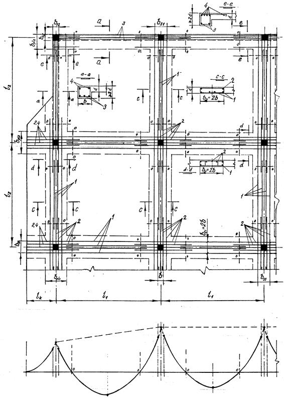 Рис.5а. Размещение рабочей арматуры объемного армирования условных ригелей. 1 – рабочая пролетная нижняя арматура средних ригелей, 2 – рабочая верхняя арматура над колоннами, 3 – пролетная рабочая арматура бортовых балок, 4 – надопорная верхняя рабочая арматура бортовых балок.