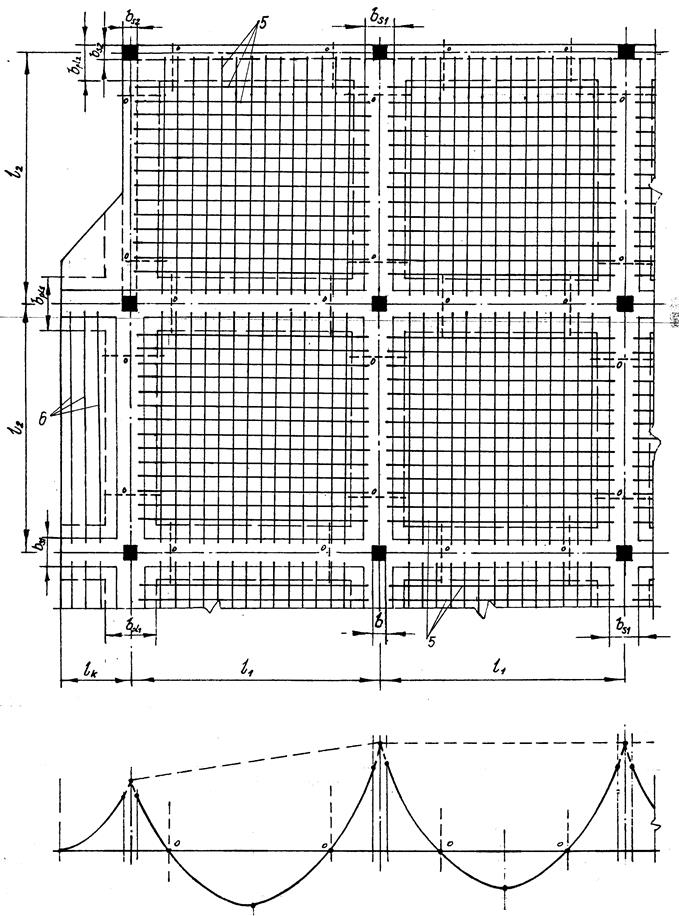 Рис. 5б. Рабочее армирование плиты перекрытия в пределах каждой ячейки каркаса. 5- нижняя рабочая арматура сетки плиты, 6 – нижняя рабочая арматура консоли плиты.