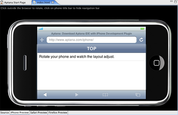 В нижней части окна редактора располагаются закладки Source, iPhone Preview, а также закладки каждого, установленного в системе браузера - Safari Preview, Firefox Preview и др. Чтобы увидеть, как приложение будет смотреться на экране iPhone, необходимо выбрать закладку iPhone Preview. Вращать данное изображение можно, кликая за пределами браузера. Помимо этого может быть скрыта навигационная панель, для этого нужно нажать на заголовочную панель телефона. Предварительный просмотр приложения iPhone возможен в горизонтальном и вертикальном режиме.