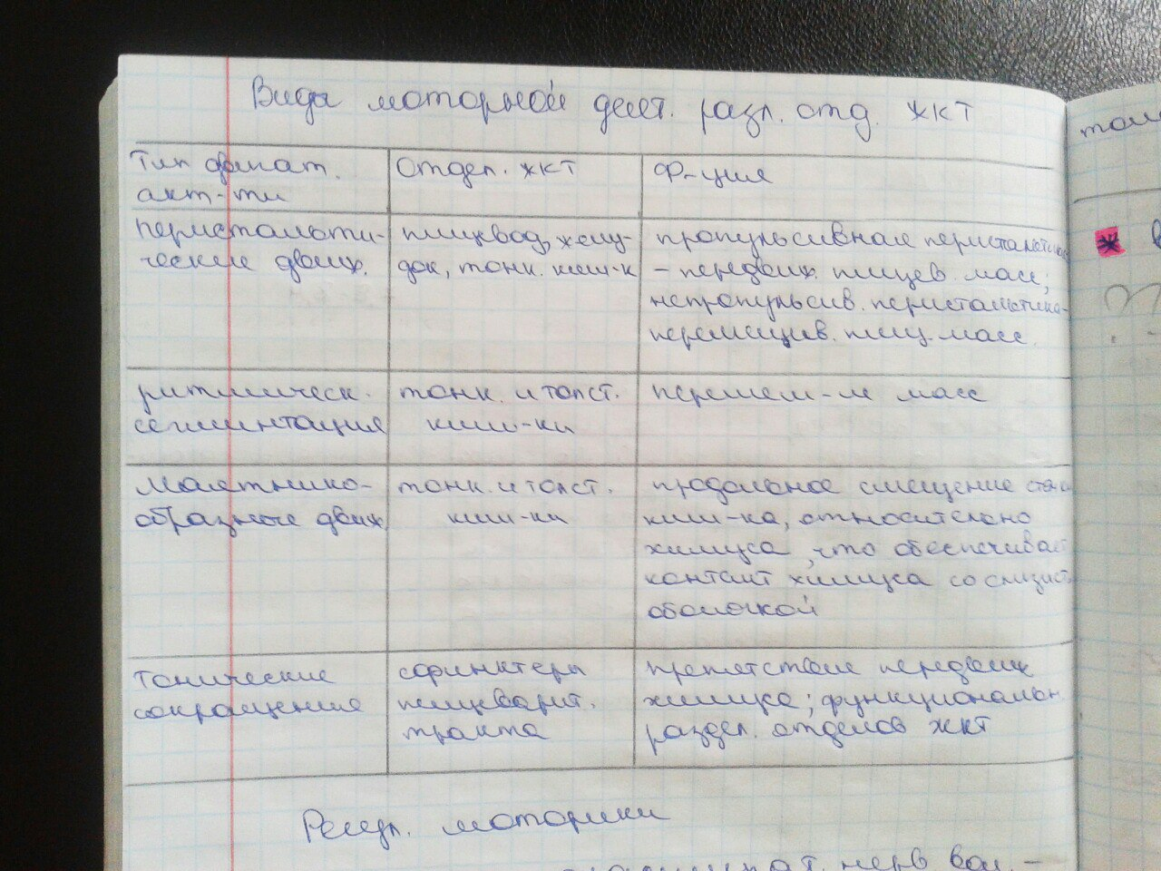 54. Виды моторной деятельности различных отделов желудочно-кишечного тракта. Регуляция моторики. Механическая обработка пищи (измельчение, перемешивание с пищеварительными соками),а также передвижение пищи зависят от моторной (двигательной) функции желудочно-кишечного тракта,то есть ритмических сокращений стенок пищеварительного канала Моторная функция желудочно-кишечного тракта слагается из перистальтики и движений неперистальтического характера К движениям неперистальтического характера в ротовой полости относят сосание, жевание и глотание В желудке происходят перистальтические,систолические и тонические сокращения Перистальтические движения осуществляются за счет сокращения циркулярных мышц желудка.Волна сокращения начинается в области кардиального сфинктера и распространяется до пилорического сфинктера.Перистальтические волны возникают с частотой 3 раза в 1 минуту Систолические движения (антральная систола) связаны с сокращением терминальной части пилорического отдела желудка.Эти движения обеспечивают переход значительной части содержимого желудка в 12пк Тонические сокращения обусловлены изменением тонуса мышц желудка.Повышение тонуса мышц приводит к уменьшению объема желудка и к повышению давления в нем.Длительность тонических сокращений составляет от одной до несколько минут. При понижении тонуса мышц,особенно дна желудка,объем органа увеличивается и создаются условия для поступления большего количества пищи При пустом желудке возникают периодические его сокращения,сменяемые периодом покоя. У человека продолжительность работы желудка составляет 20-50 минут,покоя -45-90 минут и более.Периодические сокращения желудка прекращаются с началом еды и пищеварения Кроме указанных видов сокращения в желудке может возникать антиперистальтика (при акте рвоты) Обратите внимание на то, что в тонком кишечнике наблюдаются перистальтические и неперистальтические движения Перистальтические сокращения тонкого кишечника обеспечивают продвижение пищевой кашицы по кишечнику. Этот вид двигательной активности обусловлен координированным сокращением продольного и циркулярного слоев мышц:сокращение кольцевых мышц верхнего отрезка тонкой кишки и выдавливание пищевой кашицы в одновременно расширяющийся за счет сокращения продольных мышц нижний участок. Волна перистальтических сокращений проходит вдоль всего кишечника и способствует продвижению пищевой кашицы к прямой кишке Неперистальтические движения тонкого кишечника представлены ритмической сегментацией и маятникообразными движениями Ритмическая сегментация обеспечивается сокращениями кольцевых мышц, в результате чего образующиеся поперечные перехваты делят кишку на небольшие сегменты. Через некоторое время эти поперечные перетяжки расслабляются и вновь возникают,но уже в других участках кишки.Ритмические сокращения делят пищевую кашицу на отдельные сегменты,что способствует ее лучшему растиранию и обусловлены сокращением круговых и продольных мышц кишечника.На небольшом участке в результате последовательных сокращений кольцевых и продольных мышц отрезок кишечника то укорачивается и одновременно расширяется, то удлиняется и суживается. Последовательные изменения диаметра кишки и ее длины приводят к перемещению пищевой каш