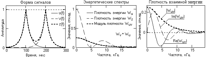 Рис. 7.2.1. Форма и энергетические спектры сигналов. На рис. 7.2.1 приведена форма двух одинаковых сдвинутых во времени и частично перекрывающихся лапласовских импульсов u(t) и v(t), а также суммарный импульс z(t)=u(t)+v(t). Плотности энергии сигналов W(f) приведены в относительных единицах плотности энергии суммарного сигнала Wz(f) на нулевой частоте. Как видно из графиков, плотности энергии сигналов являются вещественными неотрицательными функциями и содержат только реальные части. В отличие от них, плотность взаимной энергии сигналов является комплексной функцией, при этом модуль плотности по своим значениям на шкале частот соизмерим со средними значениями плотности энергии сигналов на этих частотах и не зависит от их взаимного расположения на временной оси. Для сигналов, одинаковых по форме, модуль взаимной плотности равен значениям плотности энергии сигналов.