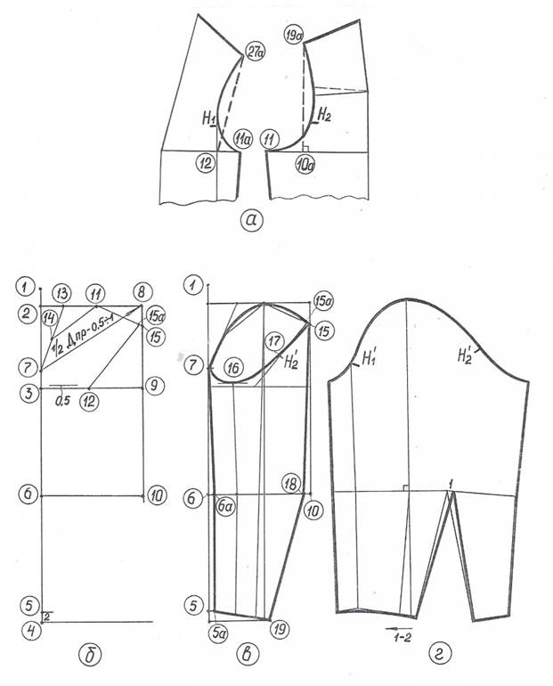 10. Точки 1-2 = 3-5см. Точку 2 отложить вниз от точки 1 (3 см – для более четкого узкого рукава, 5 см – для более свободного рукава - ближе к рубашечному покрою) 11. Точки 2-3 = Высота оката – т. 1-2 12. Точки 2-4 = Длина рукава 13. Точки 4-5 = 2см 14. Точки 3-6 = (расстояние 3-5)/2 15. Точки 2-8 = (Обхват плеча + прибавка)/2. 2-8 = 3-9. Соответственно достроить т.9 16. Точки 6-6а = 1-2см 17. Точки 5-5а = 6-6а 18. Точки 3-7 = расстояние 12-Аое (с чертежа основы) 19. Точки 2-11 = (2-8)/2 + 1 20. Точка 13 = (2-8)/2 + 1. Соединить с точкой 7 21. Точка 14 = (7-13)/2. Соединить с точкой 11 22. Точка 15 – от точки 8 вниз – ¼ ширины проймы + 0,5см 23. Точки 9-12 = 2-11. Соединить точку 12 и 15. 24. Точка 17 = (12-15)/2 25. Точки 7-16 = 12-11а (с чертежа основы). Оформить линию по лекалу (должна совпадать по конфигурации с чертежом основы) 26. Точки 16-17-15 оформить по лекалу 27. Точки 5а-19 – ширина рукава внизу / 2 28. Точка 10-18 = 1см. Соединить точки 7-6а-5а-19-18-15. 29. Из точки 16 вниз опустить перпендикуляр 30. «Отзеркалить» через кальку нижнюю часть передней и задней половинки рукава 31. Перевести нижнюю вытачку в локтевую (сутюжка) 32. Оформить плавной линией передний срез рукава 33. Оформить линию низа