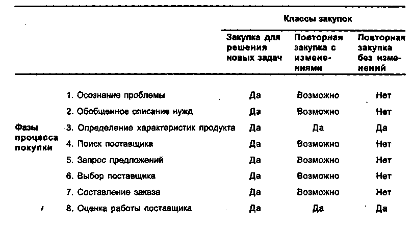Покуп-ли тов и усл пром-го назнач-я приобрет их не для личного польз-я, а для того, чтобы «делать деньги», снижать расх на произв-во или исполнять соц-е или правовые обяз-ти. Приобрет-я необход-х тов и усл есть процесс покуп-ки/приобрет-я. Обычно выд-т 8 этапов процесса покупки тов пром-го назнач-я, кот наз-ся фазами покупки(табл. 7). А сама модель получила назв сетки процесса покуп-ки.