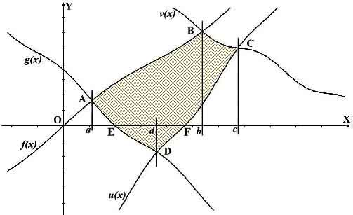 4) Площадь фигуры ограниченной линиями. Теперь рассмотрим более сложную конструкцию. На рисунке ниже мы видим четыре разных функции и плоскость, которую они образуют. Что бы найти её площадь нам надо рассмотреть каждую её часть, которая соответствует одной функции.