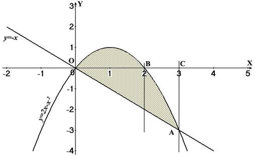 Третий очень похож к первому, но только наша трапеция размещена, не над осью абсцисс, а под ней. Поэтому здесь надо брать такой же интеграл, только со знаком минус, потому что значение интеграла будет отрицательным, а значение площади должно быть положительное. Если вместо функции f(x) взять функцию –f(x), то её график будет такой же просто симметрически отображен относительно оси абсцисс. Пример 4: Вычислить площадь надграфика функции Чертим график, убеждаемся что он в нижней полуплоскости на данном промежутке, далее вычисляем интеграл:
