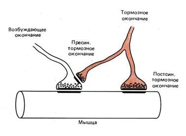 Механизм пресинаптического торможения: Гистологическим субстратом такого торможения является аксональные синапсы. К возбуждающему аксону подходит вставной тормозной аксон, который выделяет тормозной медиатор ГАМК (гамма-аминомасляная кислота). Этот медиатор действует на постсинаптическую мембрану, которая является мембраной возбуждающего аксона, и вызывает в ней деполяризацию. Возникшая деполяризация тормозит вход Са2 + из синаптической щели в заключение возбуждающего аксона и таким образом приводит к снижению выброса возбуждающего медиатора в синаптическую щель, торможение реакции. Пресинаптическое торможение достигает максимума через 15-20 мс и длится около 150 мс, то есть гораздо дольше, чем постсинаптическое торможение. Пресинаптическое торможение блокируется судорожными ядами - бикулином и пикротоксин, которые являются конкурентными антагонистами ГАМК. Механизм постсинаптического торможения: Обусловлено выделением пресинаптическим окончанием аксона тормозного медиатора, который снижает или тормозит возбудимость мембран сомы и дендритов нервной клетки, с которой он контактирует. Оно связано с существованием тормозных нейронов, аксоны которых образуют на соме и дендритах клеток нервных окончаний, выделяя тормозные медиаторы - ГАМК и глицин. Под влиянием этих медиаторов возникает торможение возбуждающих нейронов. Примерами тормозных нейронов являются клетки Реншоу, клетки Пуркинье, звездчатые клетки коры большого мозга и др. В основе гиперполяризации мембраны сомы нейрона лежит повышение проницаемости постсинаптической мембраны для К+. Вследствие гиперполяризации уровень мембранного потенциала удаляется от критического (порогового) уровня. То есть происходит его увеличение - гиперполяризация. Это приводит к торможению нейрона. Date: 2015-07-27; view: 1369; Нарушение авторских прав |
