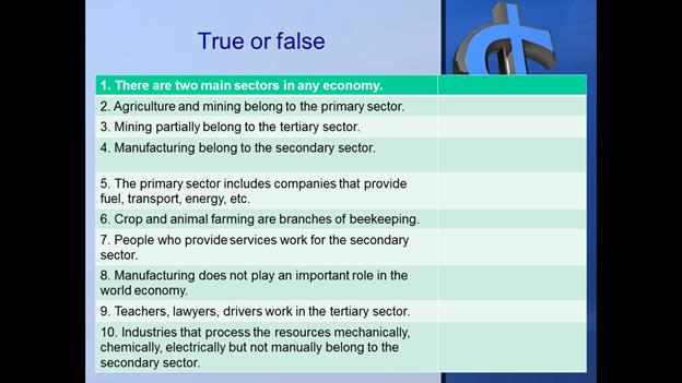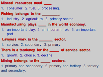Exercise 1. Finish the following sentences. There are three ….. Mining belongs …. There are countries ….. Teachers, doctors …. There are two main branches…. The primary sector…. People who do not…. Manufacturing plays an important …. The sector also includes … Manufacturing industries which …. Exercise 2. Find in the text and read the beginning of the following sentences. …, and the tertiary sector. … beekeeping also belong to this sector. …, and transport for manufacturing. … belong to the secondary sector. … and other public services. …, especially in industrialized countries. … work for the secondary sector. …, such as agriculture and mining. … need industrial processing. …, for example plant and factory managers. Exercise 3. Give the equivalents of the following words and word combinations. Три основные сектора, включают отрасли, частично принадлежит, промышленная переработка, лесное хозяйство, пчеловодство, сектор также включает, пчеловодство, страховка и другие услуги, работать в третичном секторе, богаты землей, мировая экономика, рост сектора услуг, особенно в промышленных странах, компании, которые поставляют, нуждаться в переработке, предоставлять различные услуги, также включает компании, использовать землю интенсивно. Exercise 4. Choose the correct variant.