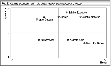 На карте, абсциссы точек являются средним значением оценки потребителем определенного сегмента восприятия цены торговой марки кофе, ординаты - ее крепости. В результате видно, насколько та или другая марка кофе воспринимается потребителями крепкой в сравнении с ценой. Притом чем ниже значения точки на оси абсцисс, тем более завышенной воспринимается цена кофе определенной марки потребителями. Из приведенной карты восприятия можно выделить несколько групп марок в терминах "крепость - цена". Самым крепким воспринимается кофе марок Jakobs Monarch і Tchibo Exclusive. Как кофе разумной стоимости воспринимается Jockey. Аналогично карты восприятия строятся с использованием других пар атрибутов: "цена - ароматность", "цена - терпкость"; "цена - вкусовые характеристики" и т. п. Карты восприятия являются действенным инструментом для сравнения позиций конкурентных марок и определения направления маркетинговых мероприятий относительно модификации товара и имиджа марки.
