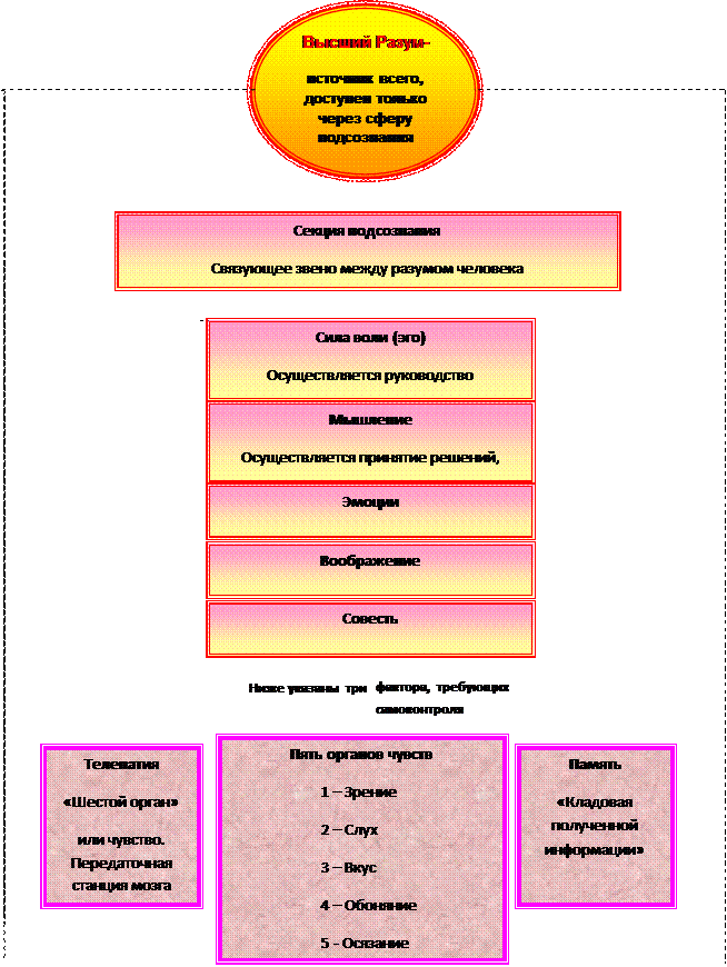 Изучая схему Наполеона Хилла, наши ученые пришли к выводу, что настало время исследовать подсознание в качестве некоего переходного звена между сознанием и космической базой знаний (у Наполеона Хилла – Высший Разум). В советское время данное предложение было не только политически рискованной идеей, но и влекло в случае провала последствия, сопоставимые с личным крахом и научной катастрофой. Неожиданно эту гипотезу горячо поддержала Н.П.Бехтерева, а вслед за ней и люди из ЦК КПСС, которые были в курсе наших работ. Когда теоретически общая идея получила осмысленные очертания, мы перешли к опытам в одном из военных научно-исследовательских институтов, где были отменная лечебно-диагностическая и тренировочная базы, а также хорошо подготовленные офицеры-испытатели. Следует отметить, что с самого начала наших работ в качестве обязательных условий ставились: безопасность экспериментов и подготовки слушателей, исключение медикаментозных препаратов, а также методов, отрицательно влияющих как на нервную систему людей, так и на их физическое состояние. Исключались также гипноз, нейро-лингвистическое программирование, холотропное дыхание и им подобные способы входа в измененные состояния сознания. Особое внимание обращалось на развитие навыков диалога с собственным подсознанием. Но нас беспокоила еще одна проблема. А в какие миры погружается наше мысленное обращение с просьбой о получении нужной нам информации? Существует ли какая-либо опасность при вхождении в тонкие миры космического пространства? Наука не имела ответа на эти вопросы. Сотрудниками Института философии Российской академии наук по нашей просьбе были изучены многие трактаты выдающихся античных, средневековых и современных мыслителей человечества, но ответа на эти вопросы мы не получили. Оставалось обратиться к ученым из религиозной среды. Прежде всего мы вышли на контакт с представителями православной церкви и некоторыми муфтиями исламского вероисповедования. Неожиданно для нас это оказались мудрые и весьма образованные люди с широкими горизонтами мышления и свободными от догм, зачастую приписываемых им обществом. Затем мы познакомились с видными деятелями других религий. Общие представления о картине духовного мира у наших новых знакомых оказались довольно-таки близкими, что позволило нам весьма уверенно построить свою парадигму и определить безопасные пути выхода в тонкие слои мысленных энергий. Иными словами, мы тщательно искали среду обитания «светлых» сил и исследовали возможность проникновения в неё. Тогда это звучало мистически, но мы уже выбрали путь исследований и не хотели с него сходить. Тем более, что принимали многие положения, высказанные нашими религиозными коллегами, в среде которых было достаточно много истинных ученых с системным и незашоренным мышлением. Хотелось бы подчеркнуть, что данный путь научного поиска не являлся единственным. Мы старались исчерпать как можно больше информации из огромного мирового опыта постижения природы способностей человека. Поэтому специальная команда психологов, философов, историков и представителей других научных дисциплин искала и исследовала отечественные и зарубежные работы о природе мысли, кодах мозга, возможностях подсознания, развитию общих способностей, проблемах интуиции и так 