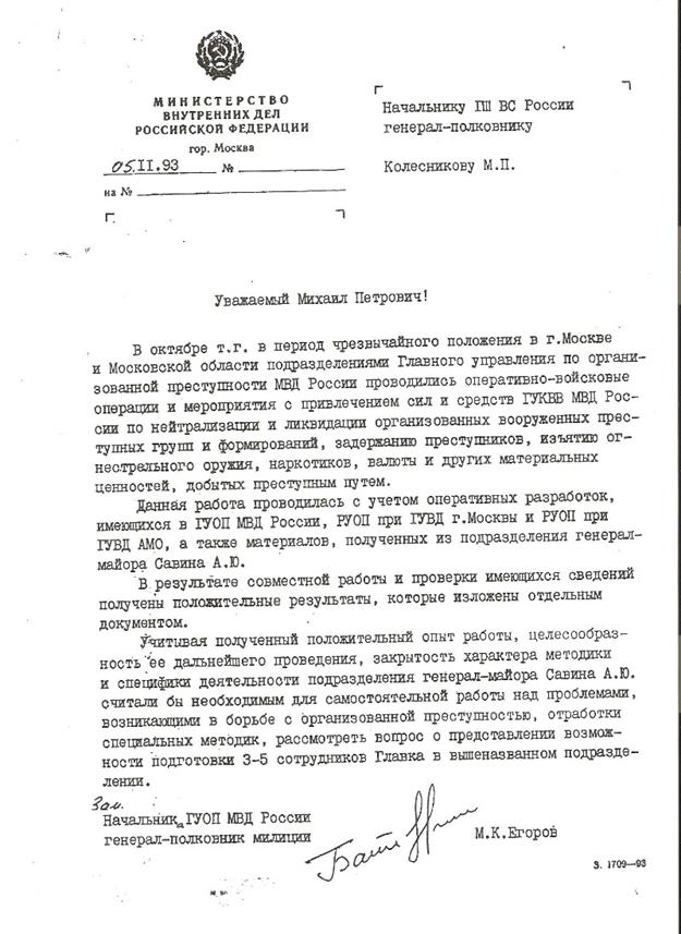 На снимке среди слушателей Института экономических стратегий присутствуют Эдвин Мэй (с бородкой и усами) и Виктор Рубель (крайний справа), которые иногда не только принимают участие в процессе обучения, но и не стыдятся усаживаться за парту вместе с нашими учениками. После продолжительной апробации методика была принята к практическому использованию в конце 1992 года. А в одной из военных академий была открыта специальная кафедра для подготовки специалистов из числа офицеров силовых структур, которая работала до 2012 года, вплоть до расформирования академии по приказу Министра обороны А.Сердюкова. Параллельно были сформированы две исследовательские группы, одна из которых состояла из офицеров войсковой части 10003, а другая из женщин – добровольцев, набранных по рекомендациям спецслужб и наших коллег-военнослужащих. О подготовке и практической работе офицеров говорить пока рановато, так как режим секретности по многим вопросам еще сохраняется, а о женской группе можно рассказать подробнее. Их подготовка осуществлялась полтора года и включала раскрытие экстраординарных способностей, саморегуляцию (аутотренинг), изучение философии, современных концепций естествознания, а также такие специальные предметы, как: ориентирование на местности, рукопашный бой, стрельбу из огнестрельного оружия, принятого на вооружение в Российской армии, стендовую стрельбу, горнолыжную, скальную, морскую, конную подготовку, освоение системы выживания в экстремальных условиях и т.п. Нужно подчеркнуть, что наши девчата с большим усердием воспринимали не только физические нагрузки, но и тот режим жизни и работы, который им был предписан на период обучения. Даже почти круглосуточные задания, отсутствие отпусков, выходных, праздничных дней и вегетарианское питание переносились без капризов и недовольства. Все были устремлены на освоение новых методов и получение высокопрофессиональных навыков. Они понимали, что стали участницами жесткого мирового интеллектуального противоборства, в котором уступать не хотелось никому. Практический результат не замедлил сказаться. Начиная с 1993 года, наша женская группа участвовала в решении многих задач, требующих поистине запредельных способностей. Их работа с лихвой перекрывала тот перечень критериев (см. выше), который в первые дни наших исканий ставил нас в тупик и вызывал сомнения. Авторитет этой группы был настолько высок, что многие женщины из ее состава привлекались к крупномасштабным мероприятиям. О результативности их работы свидетельствует письмо из Министерства внутренних дел начальнику Генерального штаба, которое привожу ниже.