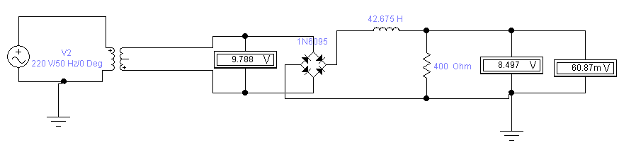 ~ RH=400 Ом; ~ КПвх = 0,67; ~ UH [в]=9 В; ~ частота пульсации m = 2; ~ КПвых=0,01.
