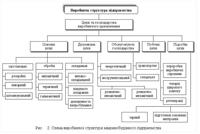 Цехи основного виробництва спеціалізуються на виготовленні профільної продукції підприємства, що призначена для задоволення потреб зовнішніх споживачів. Наприклад, на машинобудівних підприємствах до них належать ливарні, ковальсько-пресові, механічні, складальні; на металургійних — доменні, сталеплавильні, прокатні цехи; на взуттєвих та швейних підприємствах — закрійні та швейні. На великих підприємствах для побудови короткого шляху матеріального потоку та забезпечення ефективності виробничих процесів однорідні за профілем цехи об’єднуються в корпуси. На підприємствах з невеликим обсягом і відносно простими виробничими процесами доцільно обмежитися дільничною структурою підрозділів, не створюючи цехів. Основне виробництво, як правило, складається з окремих фаз або стадій, за якими класифікуються відповідні цехи: заготівельні (ливарні, ковальські, пресові, металоконструкцій та ін.); обробні (механічні, деревообробні, термічні, гальванічні тощо); складальні (цехи вузлового складання та загального складання, випробування, фарбування готових виробів і т. ін.) Допоміжні цехи сприяють випуску основної продукції, виготовляють допоміжні види виробів, які необхідні для нормальної роботи основних цехів (наприклад, виготовлення інструментів, запчастин для ремонту устаткування, виробництво енергії, надання ремонтних та енергетичних послуг). Важливішими з цих цехів уважаються інструментальні, ремонтно-механічні, ремонтно-енергетичні, ремонтно-будівельні, модельні, штампові та ін. Побічні цехи переробляють відходи основного та допоміжного виробництв і виготовляють непрофільну продукцію або відновлюють допоміжні матеріали для потреб виробництва. Наприклад, цех виробництва товарів широкого вжитку, цех регенерації формовочної суміші, мастил, обтиральних матеріалів тощо. Підсобні цехи здійснюють підготовку основних матеріалів для основних цехів, а також виготовляють тару для упакування продукції. Обслуговуючі цехи і господарства виробничого призначення забезпечують нормальну роботу основних та допоміжних цехів шляхом транспортування і збереження сировини, напівфабрикатів, готової продукції, проведення необхідних санітарно-технічних заходів, підтримання благоустрою їх приміщень і території тощо. До категорії обслуговуючих господарств належать: складське господарство, у складі якого різноманітні склади та комори; транспортне господарство, яке формується на базі депо, гаражів, ремонтних майстерень, транспортних та вантажно-розвантажувальних засобів; санітарно-технічне господарство, що об’єднує водопровідні, каналізаційні, вентиляційні та опалювальні пристрої; центральна заводська лабораторія, яка складається з відповідних лабораторій механічної, металографічної, хімічної, пірометричної, рентгенівської тощо. У виробничу структуру не входять різні загальнозаводські служби, а також господарства і підрозділи капітального будівництва, охорони довкілля, культурно-побутового обслуговування працівників, наприклад, житлово-комунальне господарство, підсобне господарство, їдальні, профілакторії, медичні установи, дитячі ясла, садки, клуби, спортивні та оздоровчі підрозділи тощо. Чинники виробничої структури. У практичній діяльності фахівці, використовуючи термін «виробнича структура підприємства», вкл