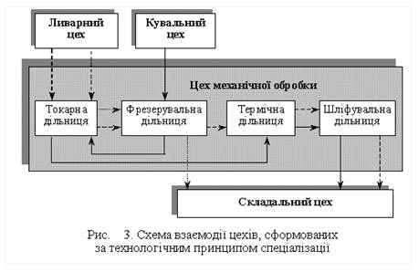Технологічна структура характерна для одиничного і дрібносерійного виробництв з випуском різноманітної та нестійкої номенклатури виробів. З поглибленням спеціалізації виробництва, а також стандартизації й уніфікації виробів та їх частин технологічний принцип формування цехів, як правило, доповнюється предметним, за якого основні цехи створюються за ознакою виготовлення кожним з них певного виробу або його частини. Побудова предметної форми спеціалізації передбачає концентрацію в основних цехах усіх операцій з отримання часткових або готових виробів. У таких цехах повністю виготовляються закріплені за ними деталі або вироби вузької номенклатури, наприклад, один виріб, кілька однорідних виробів або конструктивно-однорідних деталей (рис. 5). Так, на автомобільному заводі функціонують цехи двигунів, кузовів, шасі, рам, заднього мосту тощо; на взуттєвій фабриці організовані цехи чоловічих черевиків, жіночого модельного взуття та ін.