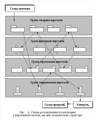 При технологічній спеціалізації виготовлення за конструктивними характеристиками простої однорідної продукції здійснюється шляхом послідовної переробки незмінної за своїм складом сировини. Це визначає послідовне розташування устаткування на певній площі, що забезпечує прямоточний характер просування предметів праці у виробничому процесі. Розміщення устаткування на механічній дільниці, побудованій на технологічному принципі, показано на рис. 4. Переваги технологічної структури полягають у поширенні регулювання завантаження устаткування, повнішому використанні матеріалів; розширенні можливостей маневрування робітниками завдяки їх високій кваліфікації, універсалізації, обміну досвідом; застосуванні прогресивної технології; більшій гнучкості в разі освоєння випуску нової продукції та розширенні її номенклатури; спрощенні технічного керівництва підрозділом; додатковому системному ефекті за рахунок посилення функціональних, синергійних та спрощених просторових зв’язків. Недоліки технологічної структури: з причин великої номенклатури збільшуються втрати часу на переналагодження устаткування на інші види продукції і, відповідно, тривалість виробничого циклу; зменшується відповідальність за якість і строки виготовлення виробів у цілому; нераціональні і довгі маршрути руху деталей за групами верстатів, які зумовлені частими змінами складу і послідовності операцій, що внеможливлюють їх розташування за ходом технологічного процесу; ускладнюється та дорожчає внутрішньозаводське кооперування; ускладнюється планування і диспетчерування процесів.