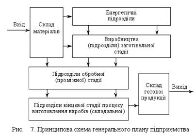 При створенні підприємства розробляється генеральний план, який являє собою графічне відображення його території з усіма будівлями, спорудами, комунікаціями, транспортними шляхами та сполученнями, що прив’язані до певної території (місцевості). На практиці в кожного підприємства є спроектований та фактичний генеральний план просторового розташування виробництв, цехів та господарств на території. В основі генерального плану лежать просторові зв’язки елементів виробничої системи, що забезпечують економію території та виробничих площ (рис. 7).