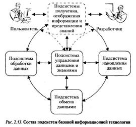 Подсистемы обработки данных строятся на базе электронных вычислительных машин различных классов и отличаются как по вычислительной мощности, так и по производительности. В зависимости от потребности решаемых задач используются как большие универсальные ЭВМ (мейнфреймы) для обработки громадных объемов информации, так и персональные компьютеры (ПК). В сети используются как серверы, так и клиенты (рабочие станции). Подсистемы обмена данными включают в себя комплексы программ и устройств (модемы, усилители, коммутаторы, кабели и др.), создающих вычислительную сеть и осуществляющих коммутацию, маршрутизацию и доступ к сетям. Подсистема накопления данных реализуется с помощью банков и баз данных на внешних устройствах компьютера, который ими управляет. Возможна организация как локальных баз и банков, реализуемых на отдельных компьютерах, так и распределенных банков данных, использующих сети ЭВМ и распределенную обработку данных. Подсистемы получения, отображения информации и представления знаний используют для формирования модели предметной области из ее фрагментов и модели решаемой задачи. На стадии проектирования разработчик формирует в памяти компьютера комплекс моделей решаемых задач. На стадии эксплуатации пользователь обращается к подсистеме отображения информации и представления знаний и, исходя из поставленной задачи, выбирает соответствующую модель решения, после чего через подсистему управления данными включаются другие подсистемы. Подсистема управления данными и знаниями, как правило, частично реализуется на тех же компьютерах, на которых реализуются соответствующие подсистемы, а частично с помощью систем управления организацией вычислительного процесса и систем управления базами данных. При больших потоках информации создаются специальные службы администраторов сети и баз данных.