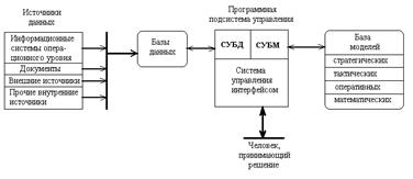 Рис. 5. Основные компоненты ИТ поддержки принятия решений. В состав системы поддержки принятия решений входят три главных компонента: база данных, база моделей и программная подсистема, которая состоит из системы управления базой данных (СУБД) и системы управления интерфейсом между пользователем и компьютером. База данных. Она играет в информационной технологии поддержки принятия решений важную роль. Данные могут использоваться непосредственно пользователем для расчетов при помощи математических моделей. Рассмотрим источники данных и их особенности. Часть данных поступает от информационной системы операционного уровня. Чтобы использовать их эффективно, эти данные должны быть предварительно обработаны. Для этого имеются две возможности: использовать для обработки данных об операциях фирмы систему управления базой данных, входящую в состав системы поддержки принятия решений; сделать обработку за пределами системы поддержки принятия решений, создав для этого специальную базу данных. Этот вариант более предпочтителен для фирм, производящих большое количество коммерческих операций. Обработанные данные об операциях фирмы образуют файлы, которые для повышения надежности и быстроты доступа хранятся за пределами системы поддержки принятия решений. Помимо данных об операциях фирмы для функционирования системы поддержки принятия решений требуются и другие внутренние данные, например данные о движении персонала, инженерные данные и т.п., которые должны быть своевременно собраны, введены и поддержаны. Важное значение, особенно для поддержки принятия решений на верхних уровнях управления, имеют данные из внешних источников. В числе необходимых внешних данных следует указать данные о конкурентах, национальной и мировой экономике. В отличие от внутренних В настоящее время широко исследуется вопрос о включении в базу данных еще одного источника данных – документов, включающих в себя записи, письма, контракты, приказы и т.п. Если содержание этих документов будет записано в памяти и затем обработано по некоторым ключевым характеристикам (поставщикам, потребителям, датам, видам услуг и др.), то система получит новый мощный источник информации. Система управления данными должна обладать следующими возможностями: составление комбинаций данных, получаемых из различных источников, использования процедур агрегирования и фильтрации, быстрое прибавление или исключение того или иного источника данных; построение логической структуры данных в терминах пользователя. использование и манипулирование неофициальными данными для экспериментальной проверки рабочих альтернатив пользователя; обеспечение полной логической независимости этой базы данных от других операционных баз данных, функционирующих в рамках фирмы. База моделей. Целью создания моделей являются описание и описание и оптимизация некоторого объекта или процесса. Использование моделей обеспечивает проведение анализа в системах поддержки принятия решений. Модели, базируясь н математической интерпретации проблемы, при помощи определенных алгоритмов способствуют нахождению информации полезной для принятия правильных решений. Пример.Модель линейного программирования дает возможность определить наиболее выгодную производственную программу выпуска нес